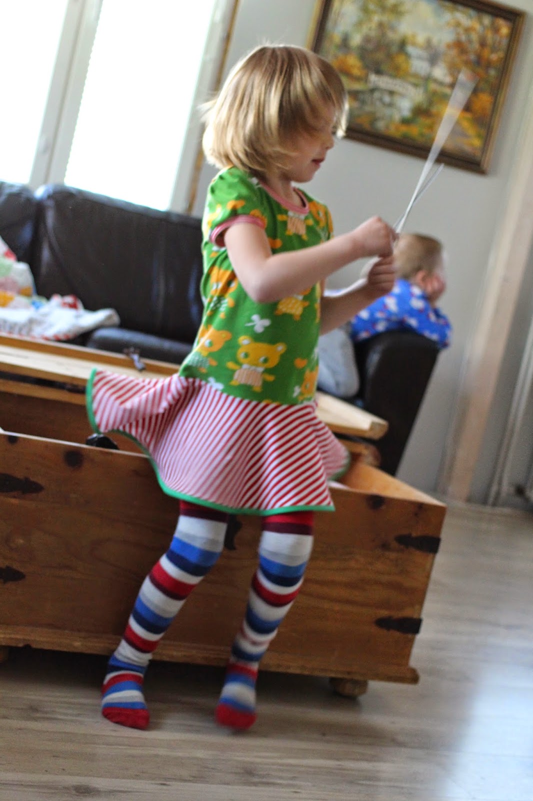 Kakkosmiehellä on taas angiina (kolmas putkeen). Aamupäivä istuttiin lääkärissä ja iltapäivän minä ompelin. 60cm vihreää nallea: pikkumiehelle setti kesään (jokainen resori eri sävyä) ja tytölle karamelli mekko. Siitä tuli kiva, neiti hyväksyi mökisematta, kai se helma vei sydämen;)
